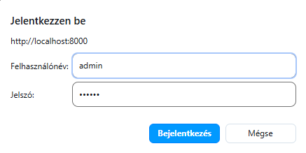 Első bejelentkezéskor az alapértelmezett felhasználónevet (admin) és jelszót (hackme) kell megadni, amit a bejelentkezés után az Admin/Users menüpont alatt módosíthatsz. Fontos megjegyezni, hogy a felhasználónév és jogosultság a webes felületen nem módosítható és manuálisan sem ajánlott.