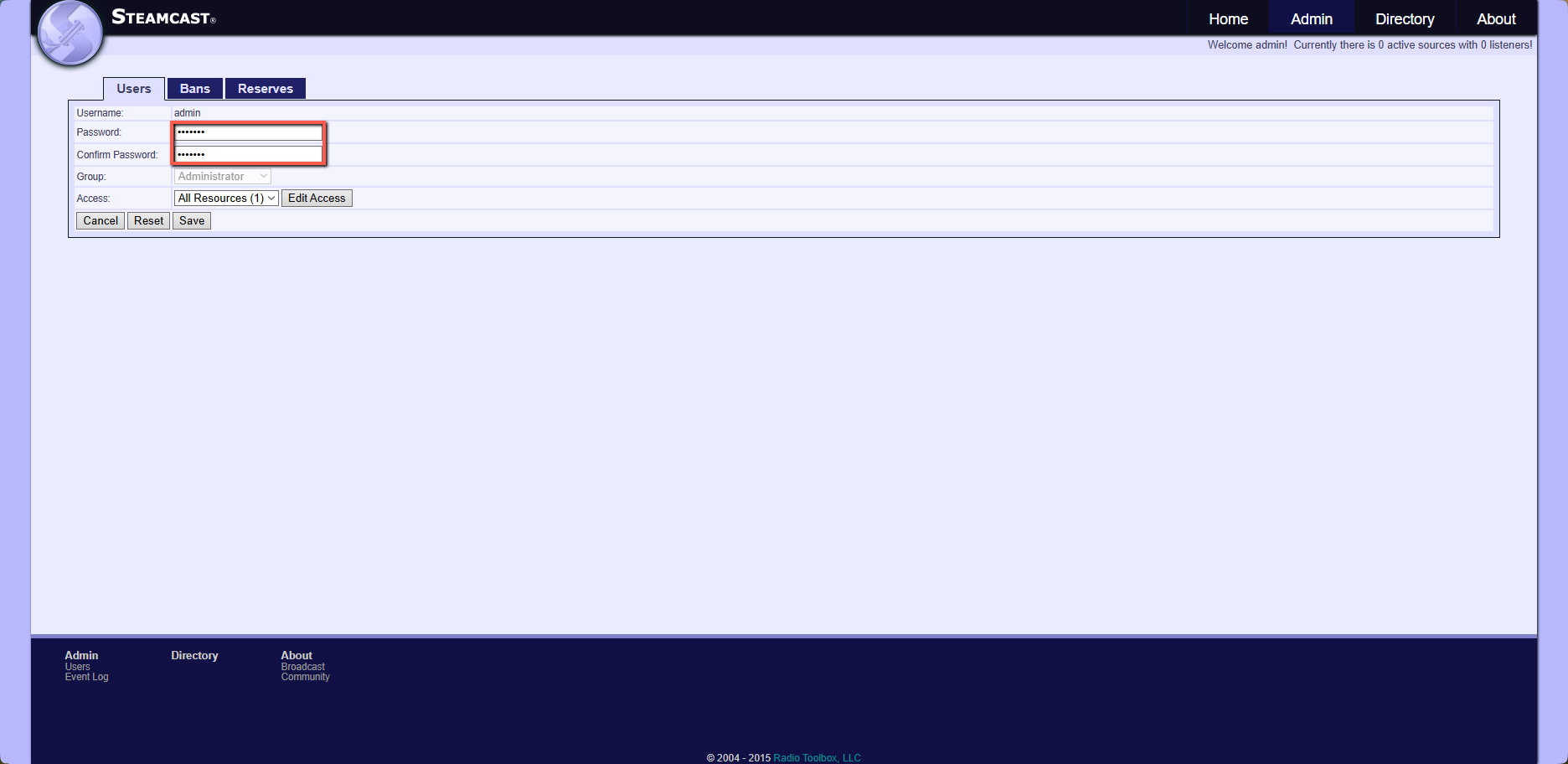 Első lépésként a már korábban említett jelszó módosítást ajánlott elvégezni, hogy ezzel többé ne kelljen foglalkozni. Az Admin menüpont a kezdő felhasználókat picit félrevezetheti, mivel nem csak egy legördülő menüt biztosit, hanem az Admin gombra kattintva a rádiószerver által létrehozott alapértelmezett konfigurációt jeleníti meg.