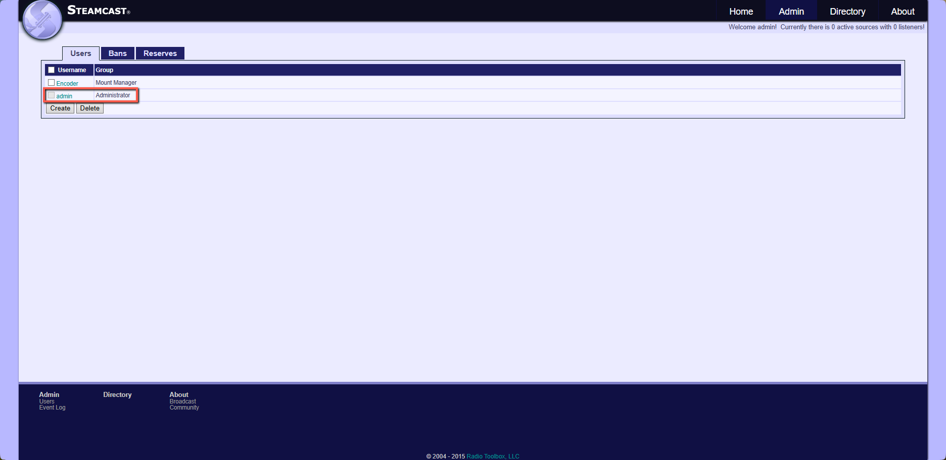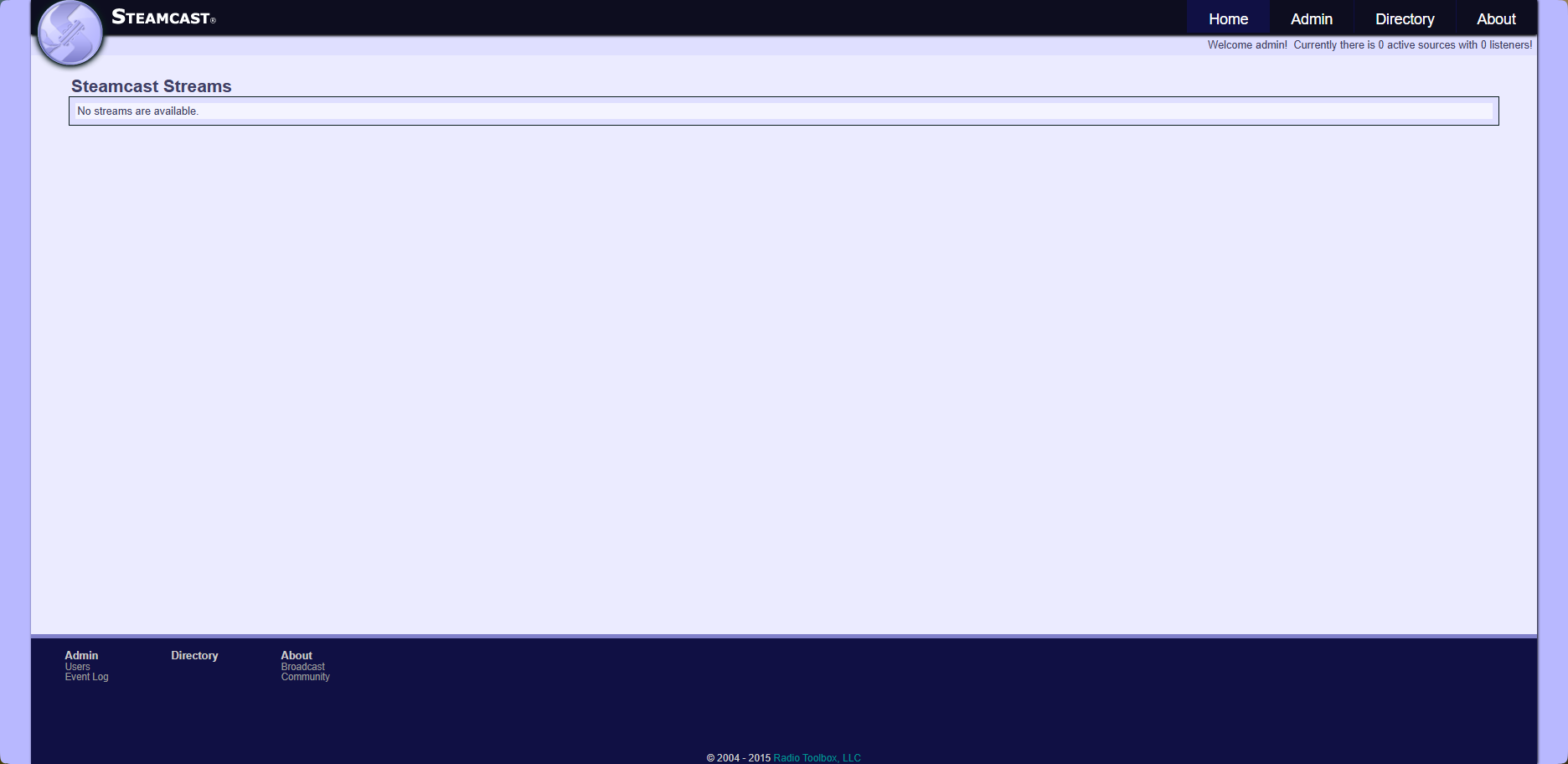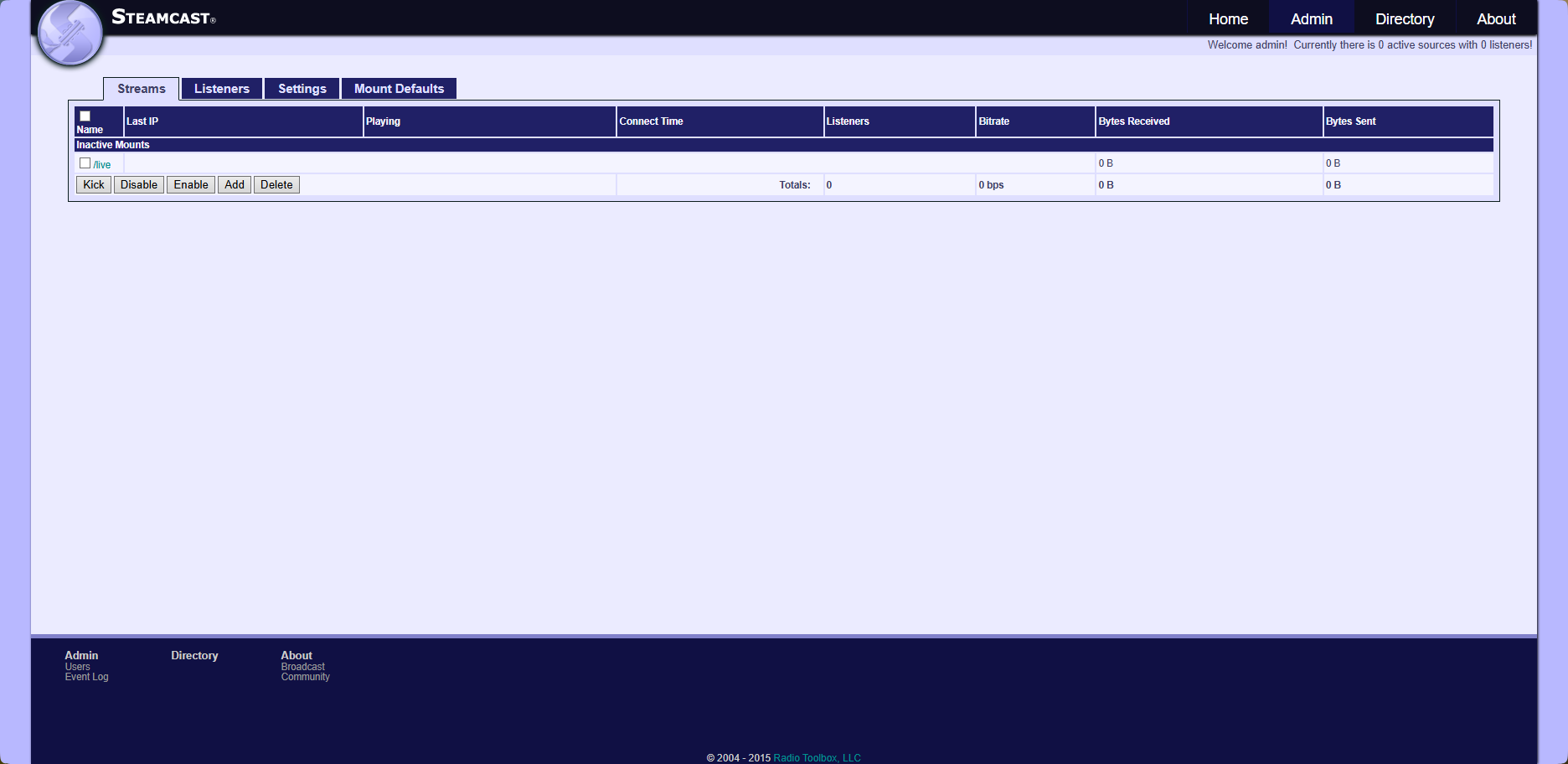 Első lépésként a már korábban említett jelszó módosítást ajánlott elvégezni, hogy ezzel többé ne kelljen foglalkozni. Az Admin menüpont a kezdő felhasználókat picit félrevezetheti, mivel nem csak egy legördülő menüt biztosit, hanem az Admin gombra kattintva a rádiószerver által létrehozott alapértelmezett konfigurációt jeleníti meg.